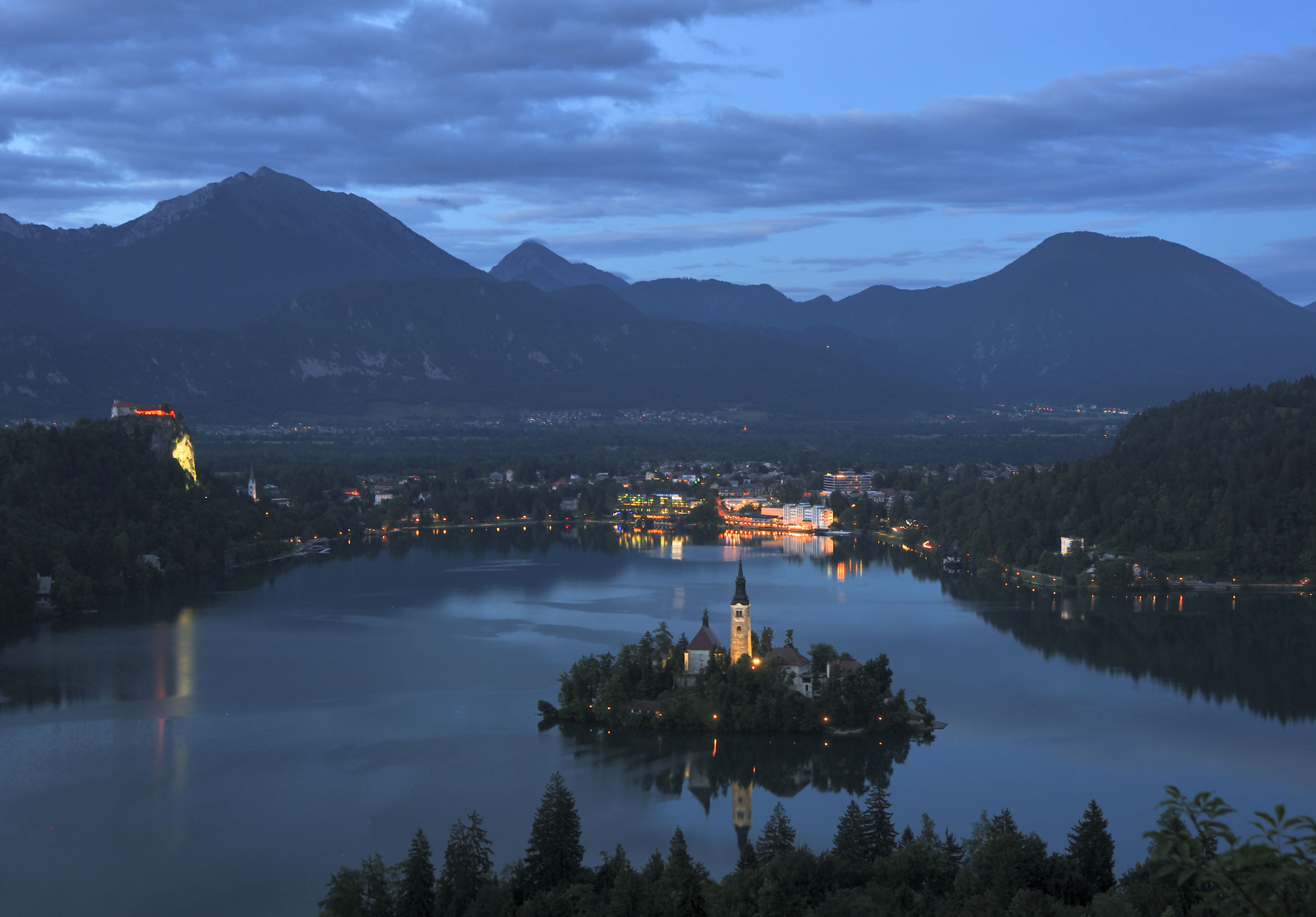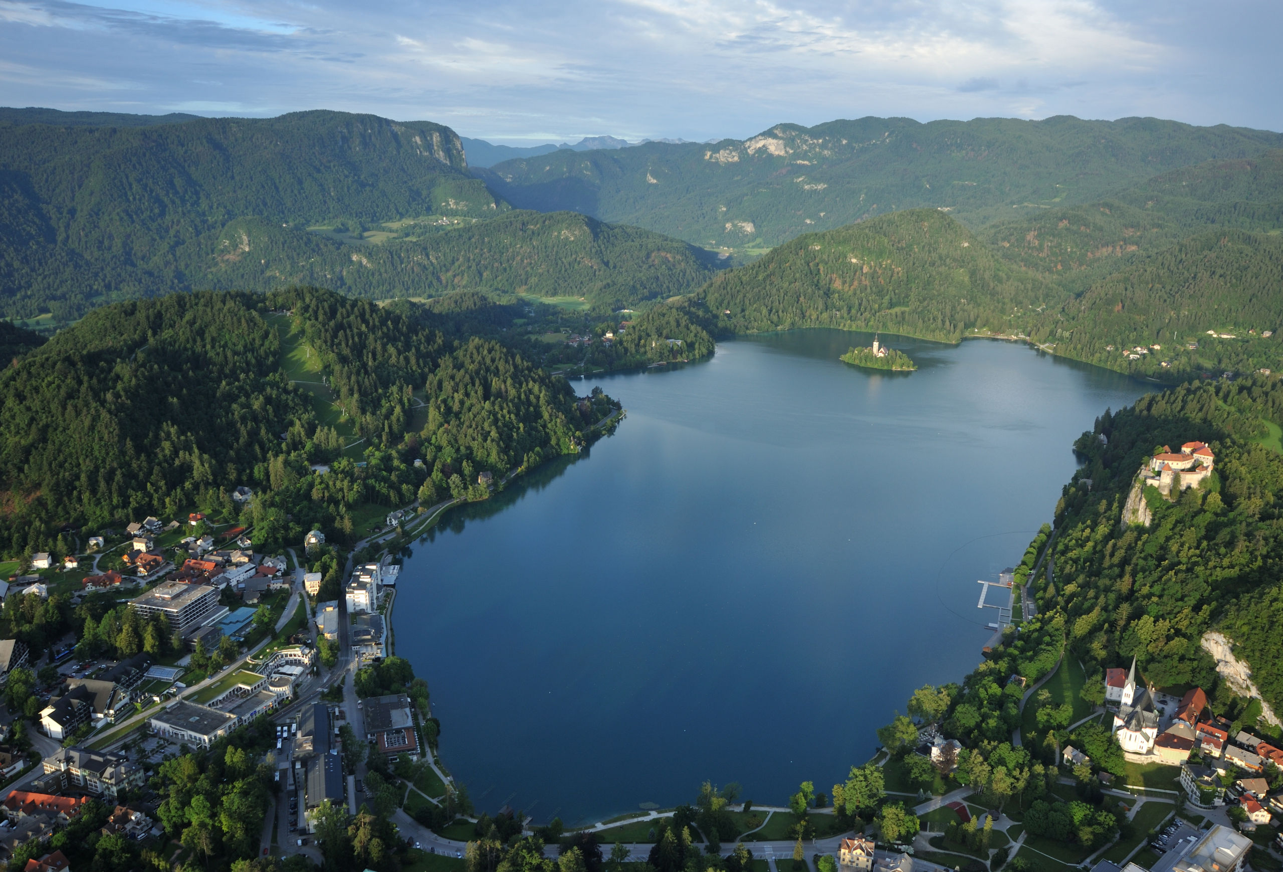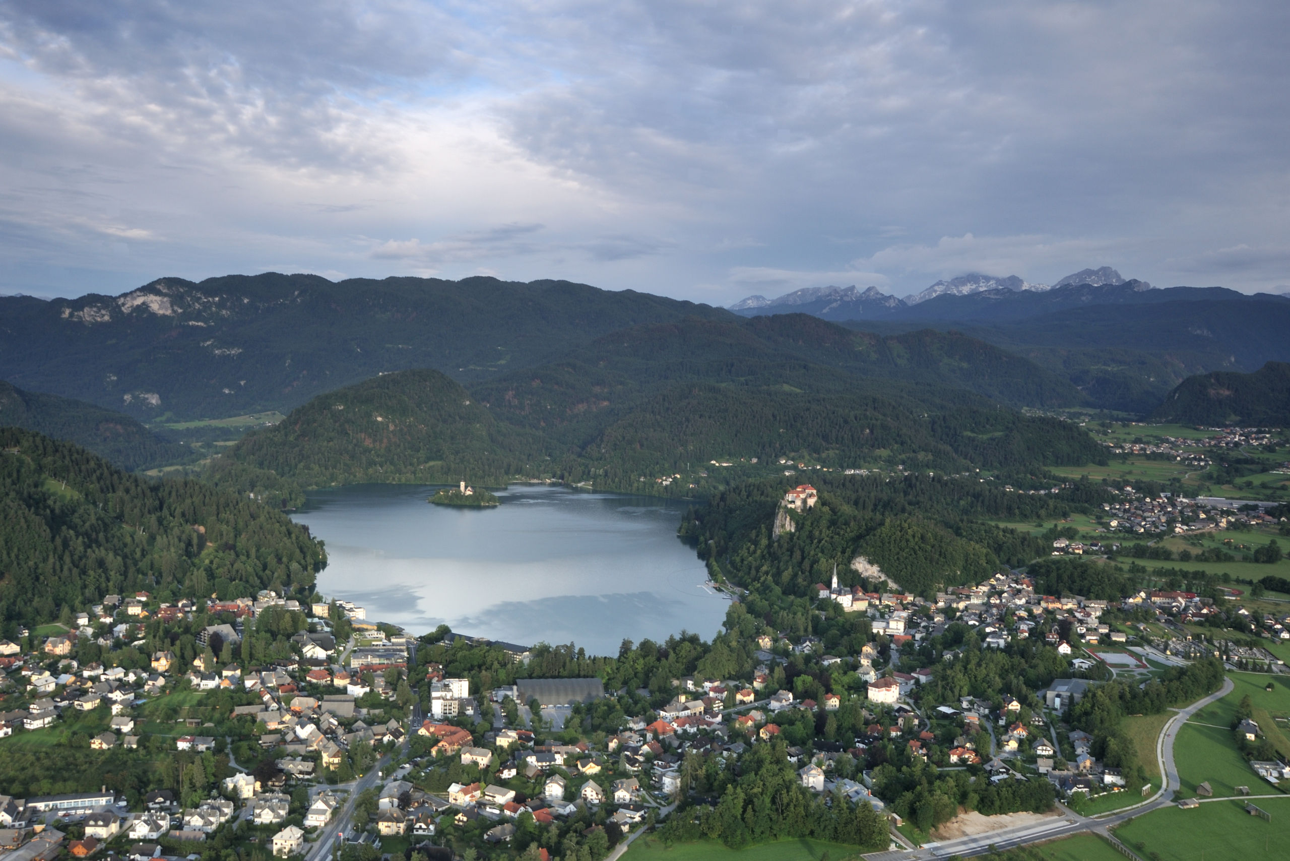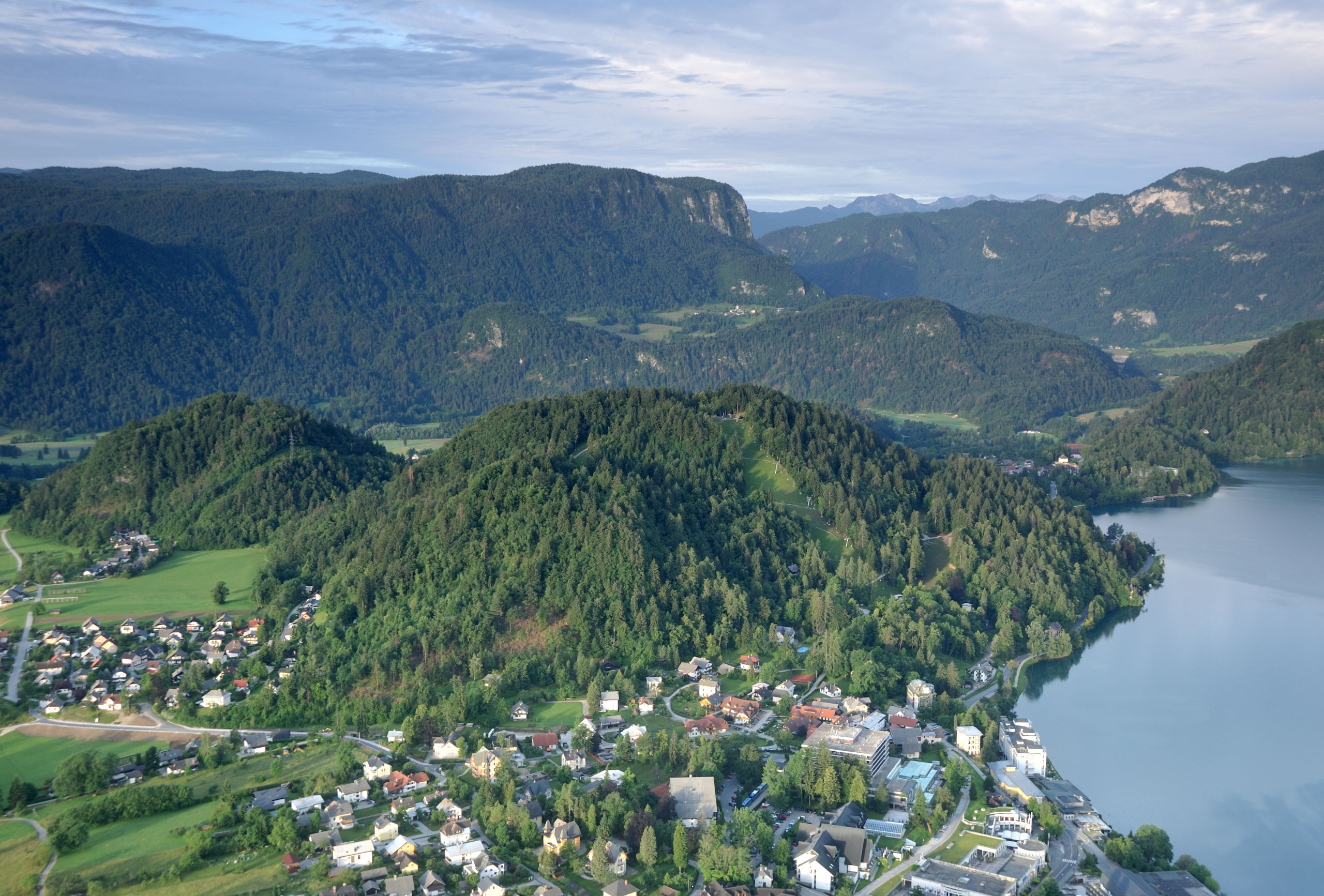 Небольшое (2.1×1.4 км) Бледское озеро — один из символов Словении: главным образом, благодаря острову с церквушкой, растиражированному на открытках и сувенирах. На его берегах летом многолюдно: на южном его берегу расположен город Блед с немеренным количеством отелей. Всего я побывал в этом месте два раза: в 2014 и 16 гг, оба раза в июне. В первый раз только съездил сюда днём, посетив Бледский замок, что возвышается на скале над северным берегом озера. Во второй раз более основательно: слетал на рассвете на воздушном шаре, сходил на окрестные вершинки.
