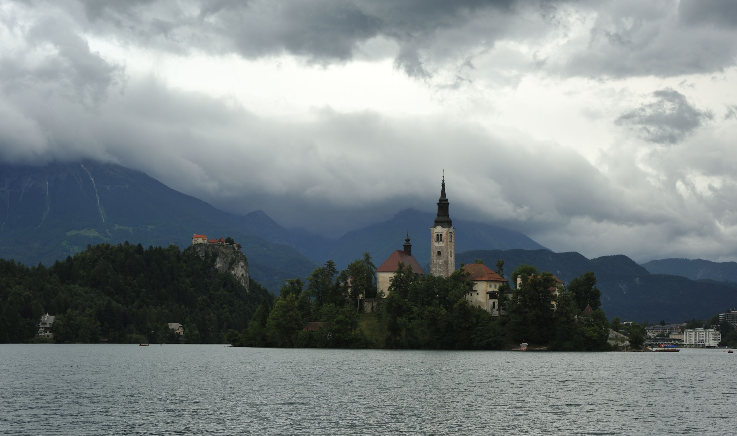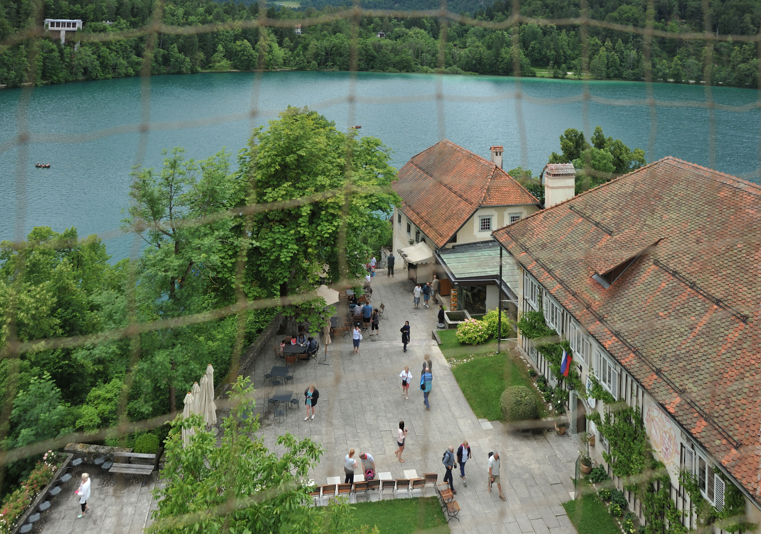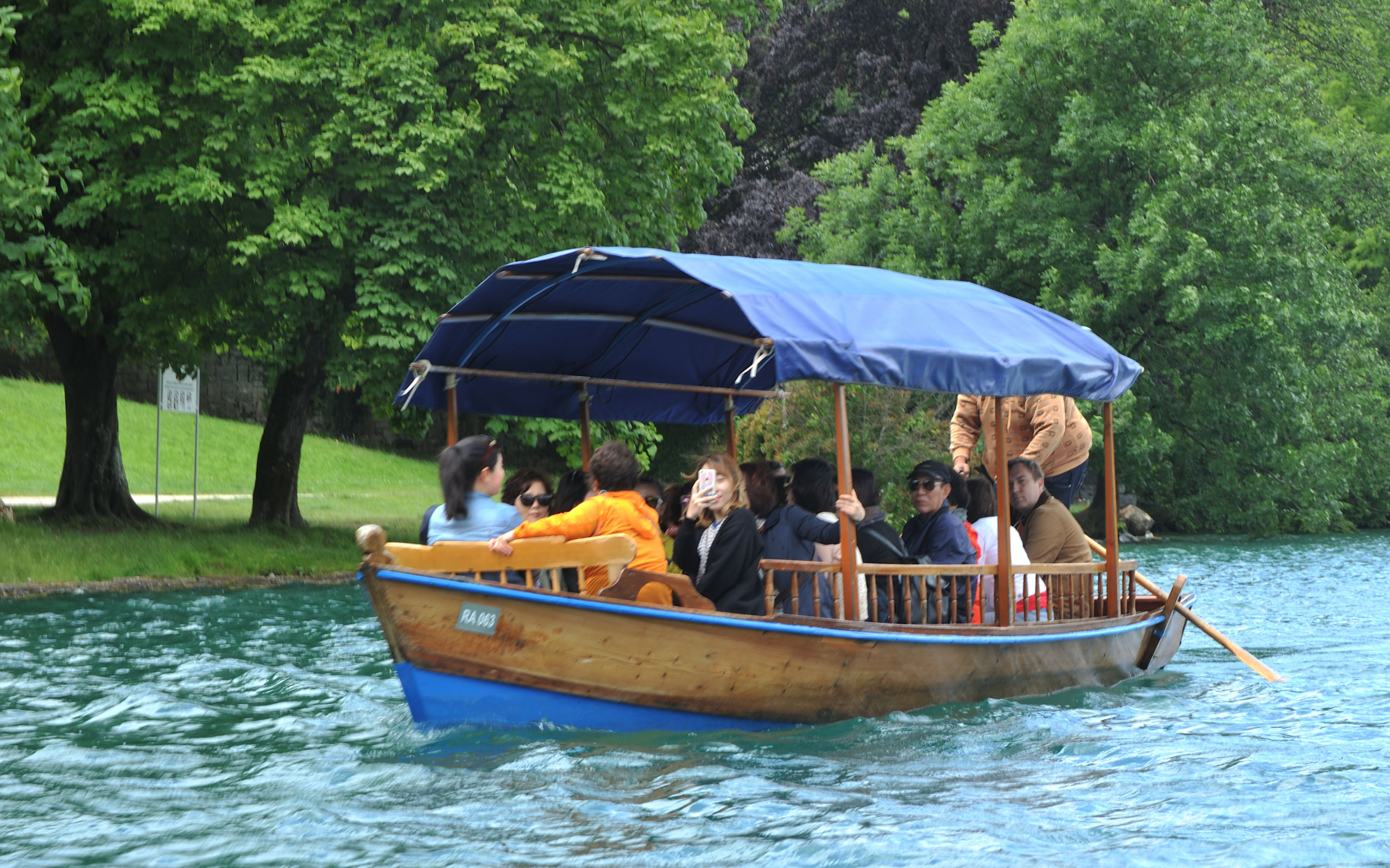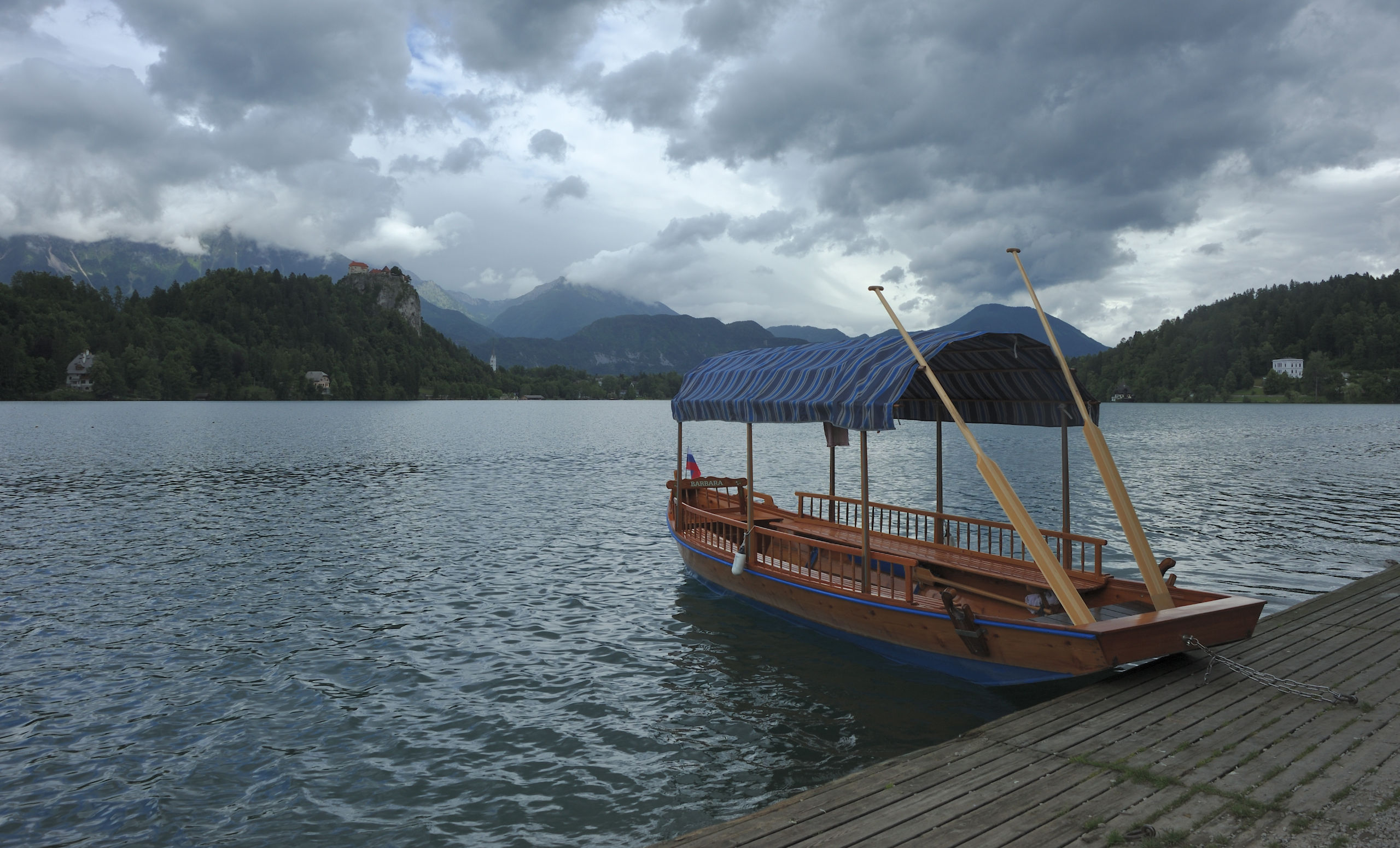 Следующий пункт программы — посещение острова Блед (который с церквушкой). Туда возят на небольших крытых лодках — «плетнях». У гребцов интересная техника: они не сидят, а стоят на корме и не спиной, а лицом по ходу движения.