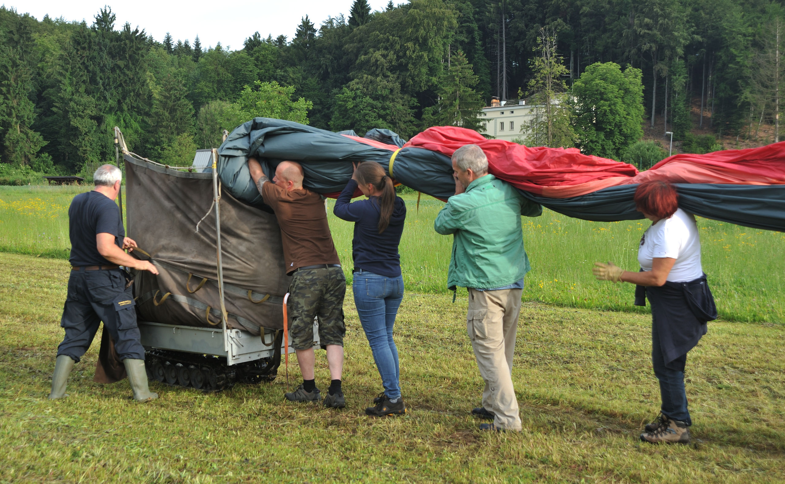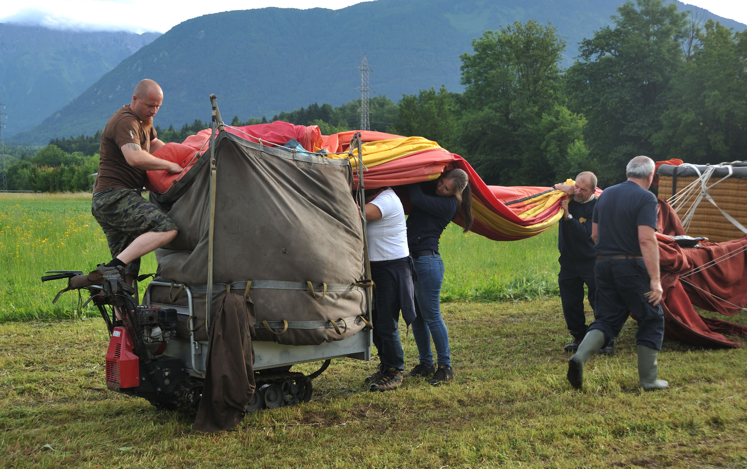 Их технический прогресс: оболочку шара разворачивают и сворачивают, погрузив тележку на мини-трактор, который идёт себе потихоньку в беспилотном режиме. Это облегчает работу (оболочка весит 280 кг), но требует бдительности: зазеваешься — задавит.